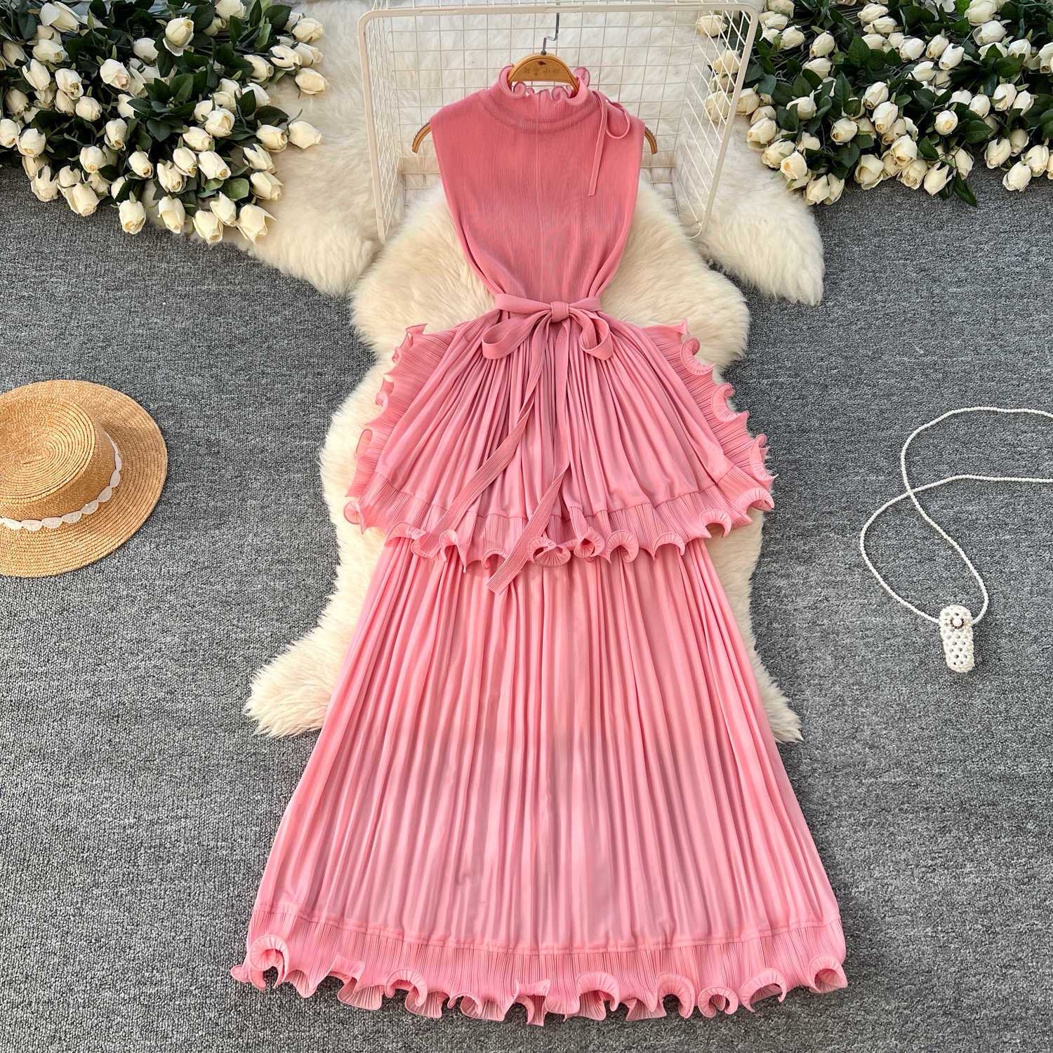European and American style light luxury sleeveless dress for women, summer, ruffled waist, elegant and unique long dress